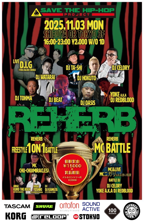 単独レギュラーイベント第39回 SAVE THE HIP-HOP PROJECT ![]() 2025年11月3日 「文化の日」 文化の日の趣旨:「自由と平和を愛し、文化をすすめる」 REHERB save the hiphop project 16:00 OPEN ~ 23:00 CLOSE エントランス 2,000yen 1D別 渋谷MITASHITA PARK内 OR 3F (1Fより階段上って3Fへ、 車椅子の方などはスタッフへ声掛け頂ければ、 エレベーターからの直接3F入口へご案内可) ![]() REHERB DJ DJ BEAT DJ TA-SHI DJ WATARAI DJ CELORY DJ OASIS DJ TOHMA DJ HOKUTO DJ TOHMA YOKE aka DJ REDBLOOD and more . . . (順不同) LIVE D.I.G(DEE CHIKA,Val,YOKE) ![]() REHERB MC BATTLE Vol.20 MC&LIVE MC☆ニガリa.k.a赤い稲妻 special guest live LAMP EYS(RINO LATINA II & DJ YAS) battle DJ YOKE aka DJ REDBLOOD battle entry fee 2,000yen prize 優勝賞金:15,000円 and 賞品 エントリー方法 X でDM → @mcnigariへ Xにアカウントが無い場合は、 REHERB事務局へe-mail →i nfo@soundactive.jp ![]() REHERB FREESTYLE 1 ON 1 BATTLE JUDGE 調整中 battle DJ 調整中 MC CHU-CHU(MIRACLES) battle entry fee 2,000yen prize 優勝賞金:15,000円 and 賞品 エントリー方法 Instagram でDM → @kona_rid へ Instagramにアカウントが無い場合は、 REHERB事務局へe-mail → info@soundactive.jp ※階段で3Fまで移動できない方(例 車椅子)は、 入場時にスタッフまでお気軽に声をかけてください。 エレベーター移動をご案内致します。 ※本サイトで記す、出演者・参加イベントの内容がまれに、 一部変更になることもございます。 その変更内容によっては、入場を希望しない場合、 当日、入場時に入場料のお支払い前に、 変更内容をスタッフにご確認ください。 一旦お支払いされた入場料は、いかなる場合も 返金致しませんこと予めご料下さい。 ※前売り入場券はございません。 以下、前回の様子 皆さまのご来場をお待ちしております。 ![]() ![]() ![]() DJ BEAT ![]() DJ HOKUTO ![]() DJ TA-SHI ![]() DJ TOHMA ![]() DJ WATARAI ![]() YOKE a.k.a DJ REDBLOOD ![]() DJ WATARAI and DJ KOYA LAMP EYS(RINO LATINA II & DJ YAS)
